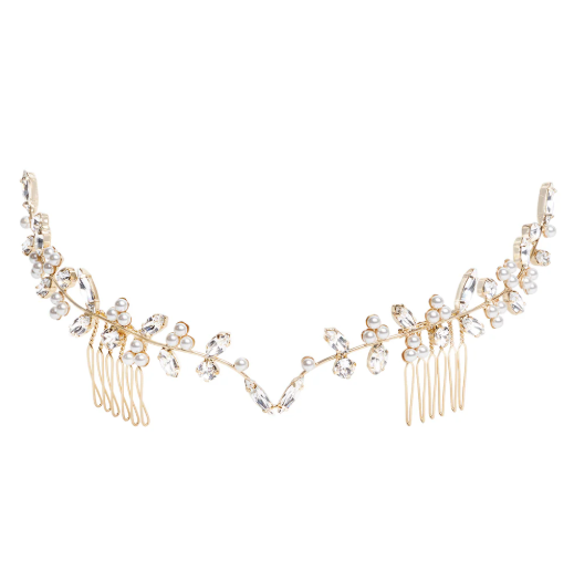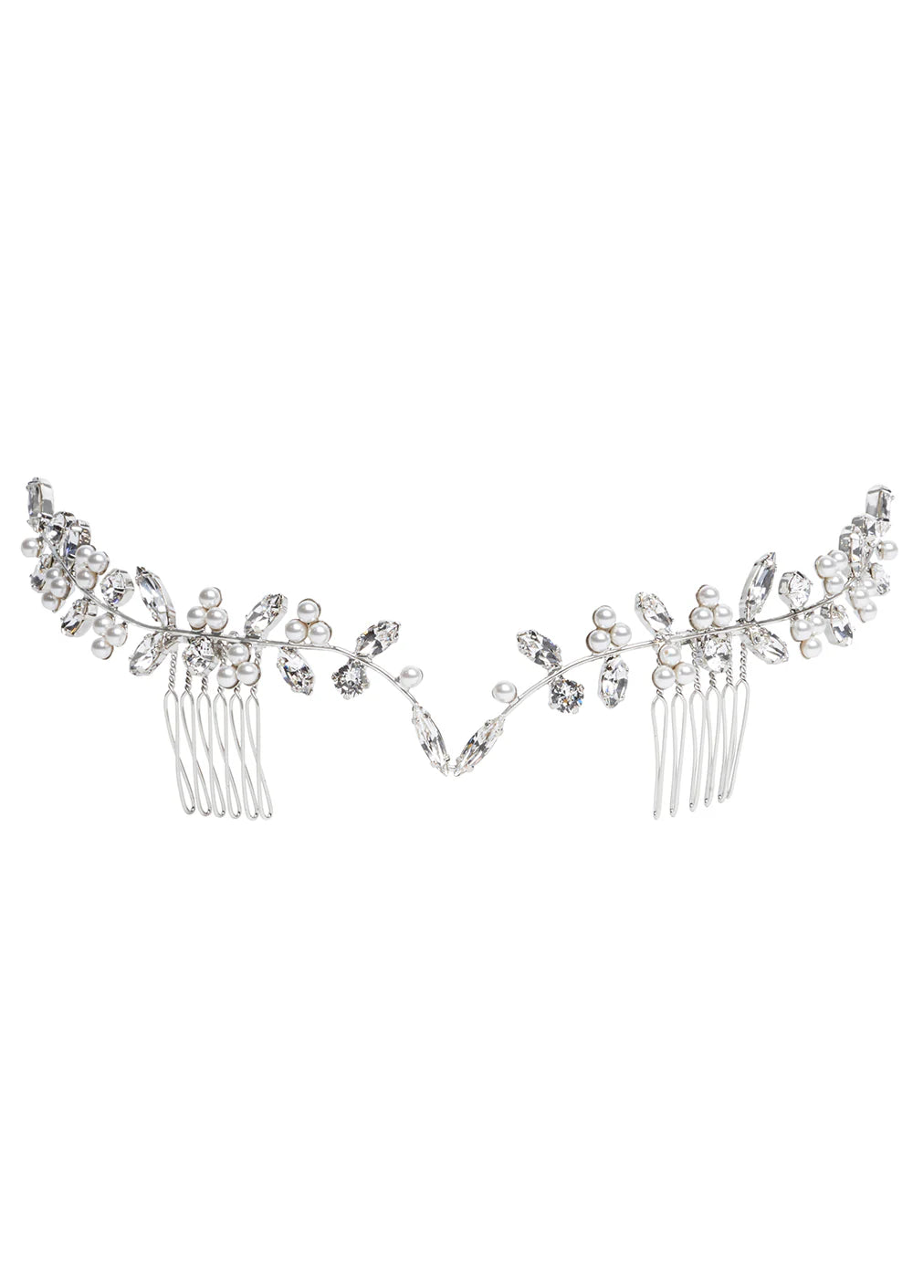 This regal garland hair accessory sparkles with delicate crystal leaves and pearl "buds" sprinkled throughout. The comb gently curves around the back of your head, setting the stage for a show-stopping entrance. Crafted with premium Swarovski Pearls and Crystals.