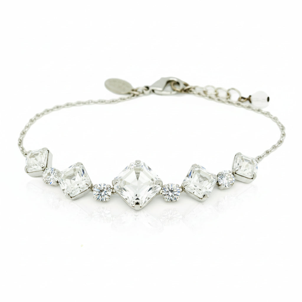 Five square cut Swarovski crystals set at an angle on a delicate chain make for a fun and glamorous Sterling Silver bracelet.