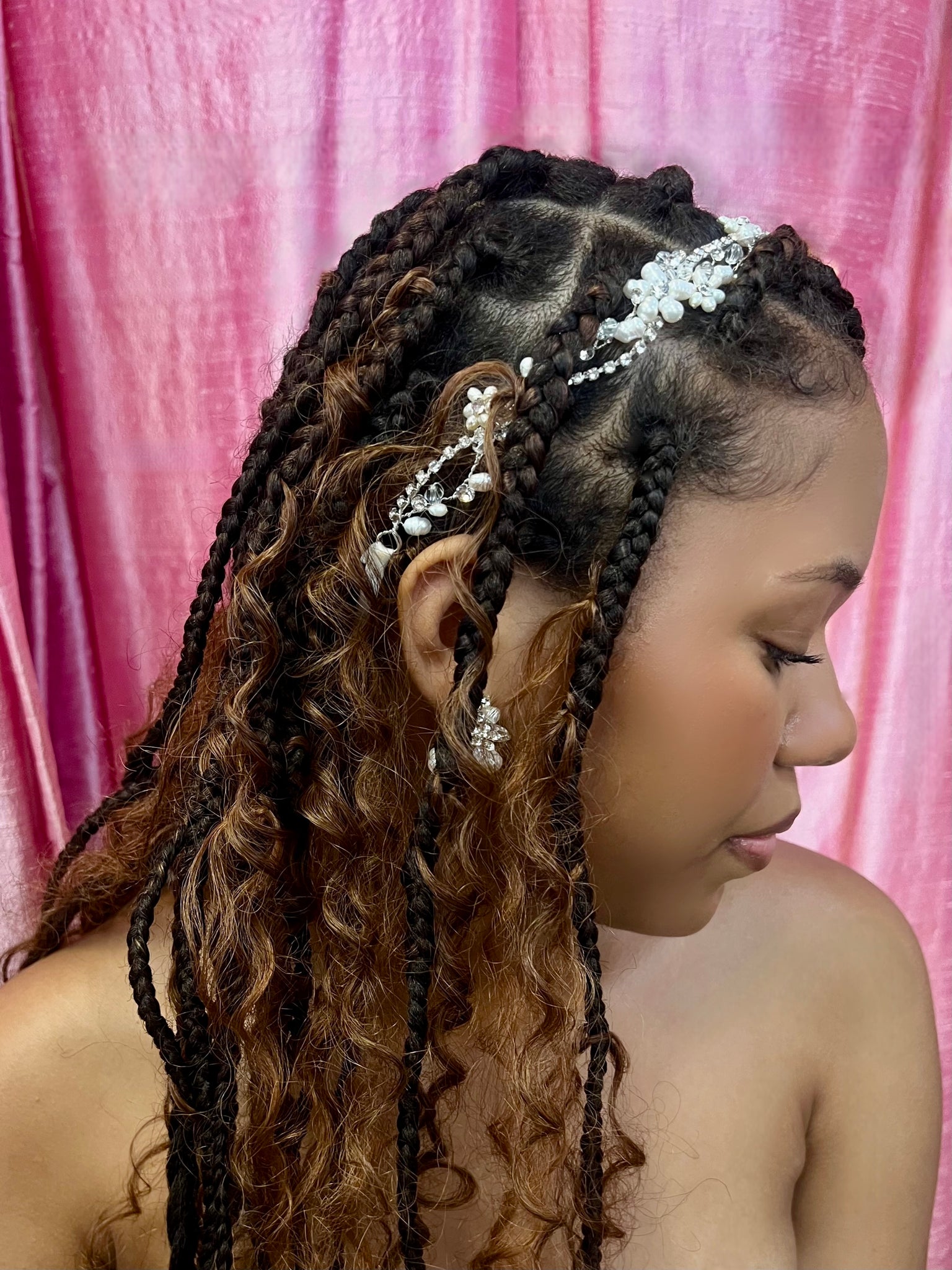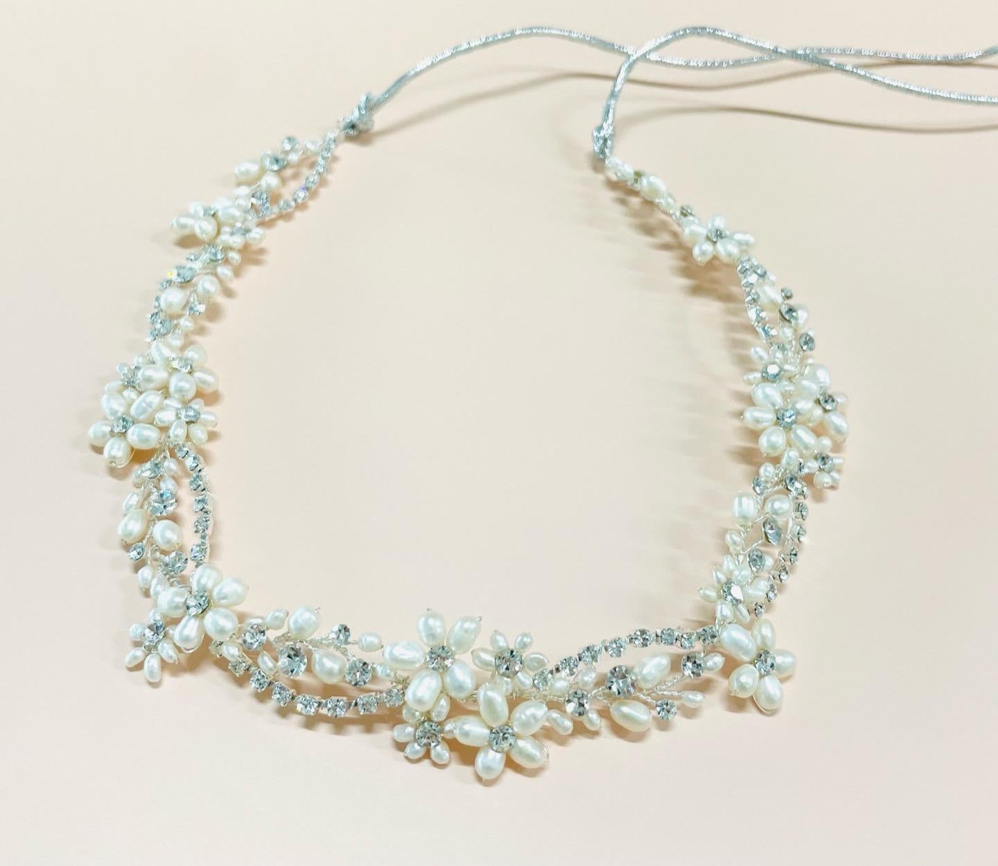 This enchanting floral hair band features delicate ivory pearl beads expertly shaped into charming flowers, creating a soft, romantic look. Each flower is beautifully accented with sparkling rhinestones, adding a touch of glamour and radiance throughout the design. The subtle sheen of the pearls paired with the dazzling rhinestones creates a perfect balance of elegance and sophistication. Whether you're dressing up for a special occasion or adding a refined touch to your everyday style, this floral hair band brings timeless beauty and a hint of sparkle to any hairstyle.
