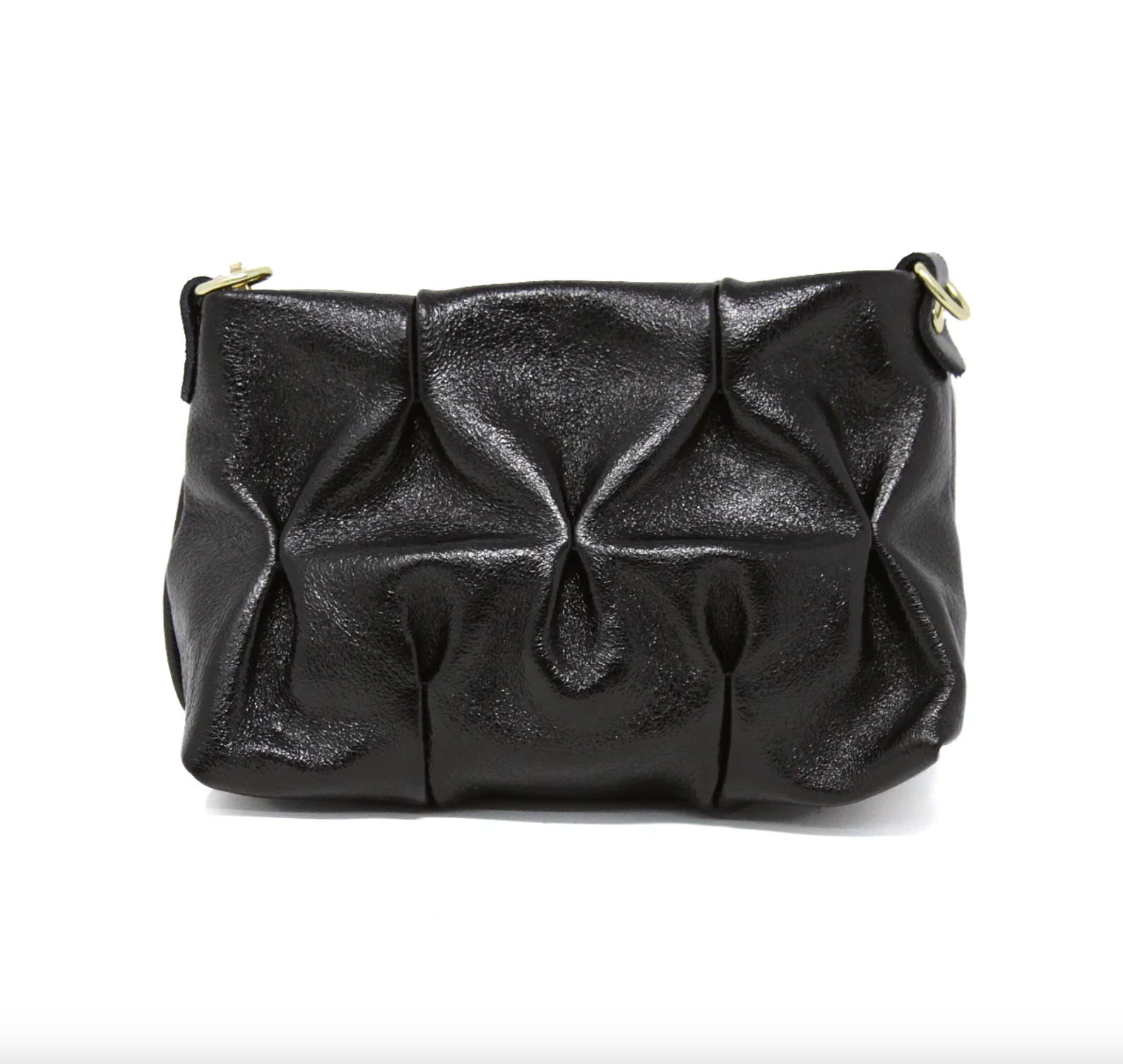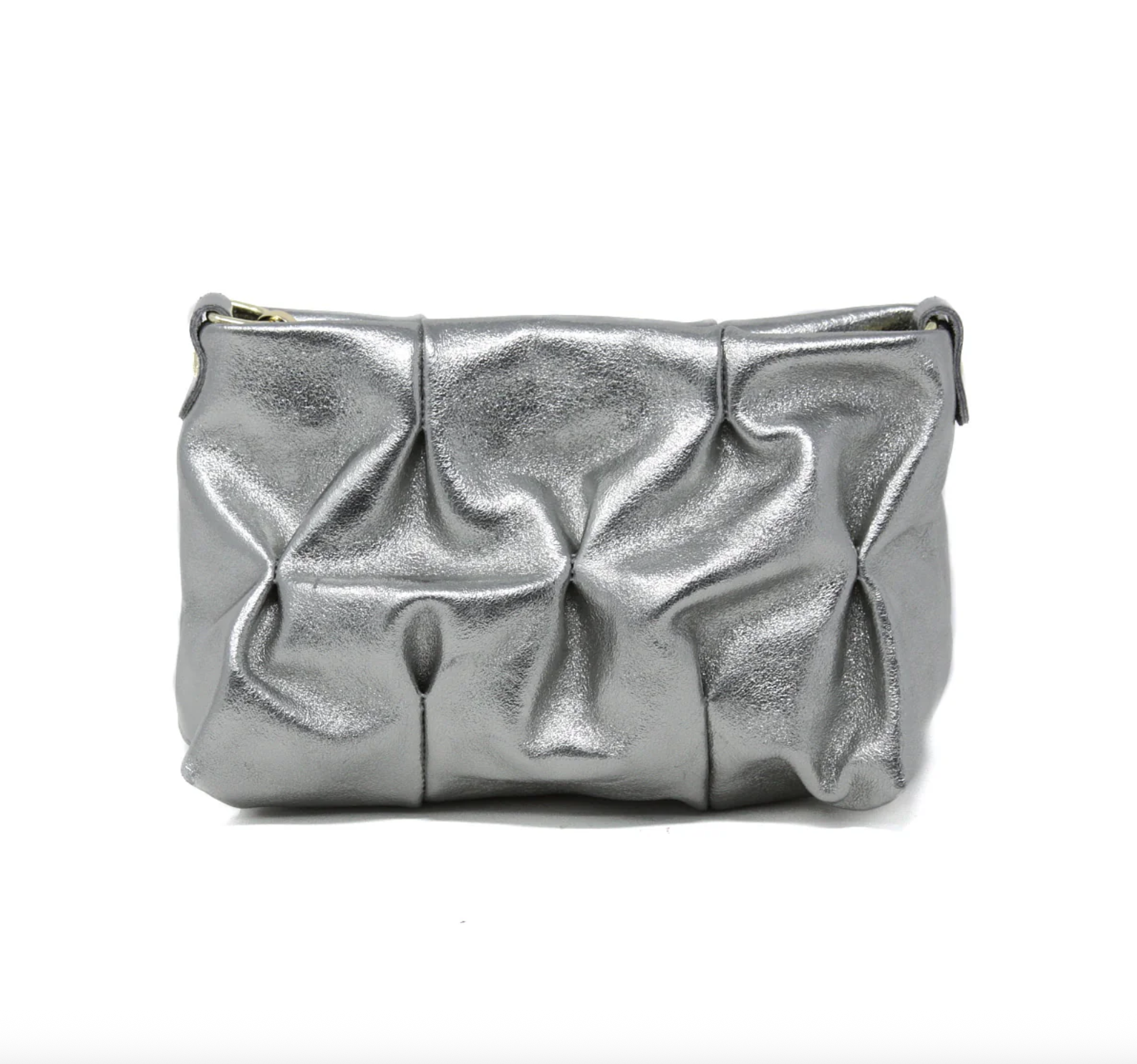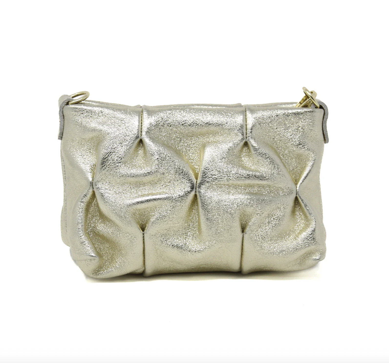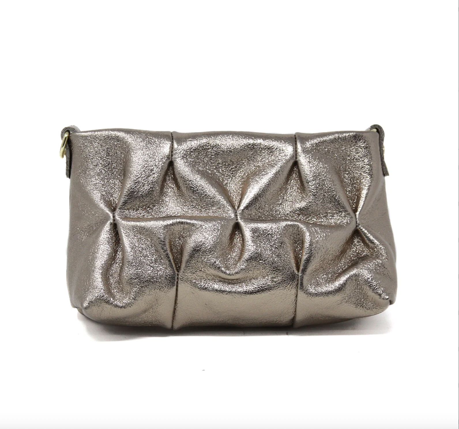 This sophisticated leather bag gleams and sparkles. It exudes luxury perfect for day into evening as it pairs perfectly with any outfit It comes with both a detachable leather wristlet for an easy carry clutch and a metal chain shoulder strap and is sure to get some attention.