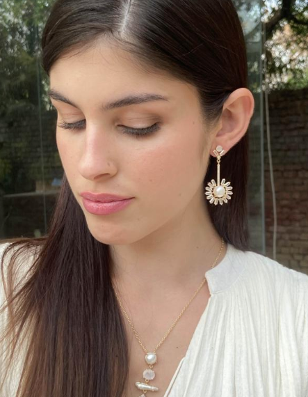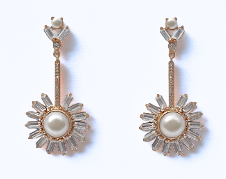 These glamorous sunburst drops feature a sizable freshwater pearl, surrounded by baguette zirconia stones. These versatile drops could resemble a sunburst or evoke a floral daisy theme for a 60s-inspired wedding.