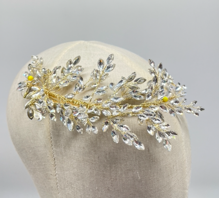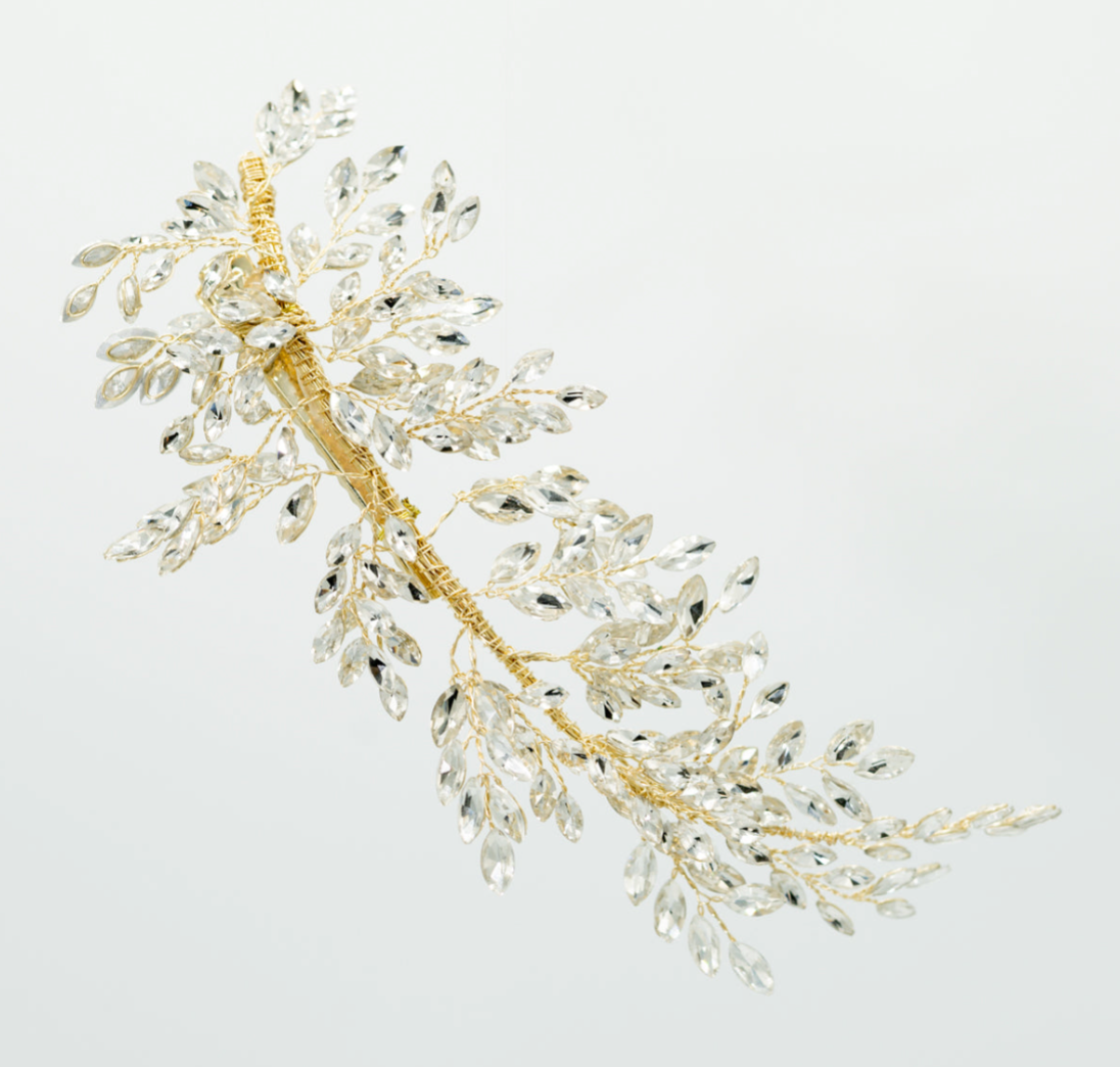 This elegant rhinestone hair clip features a stunning arrangement of sparkling rhinestones set on a luxurious gold base. The radiant stones are carefully positioned to create a sophisticated design that catches the light beautifully from every angle. Malleable gold wire accents add a touch of flexibility and refinement, allowing the clip to mold perfectly into your hairstyle. Ideal for weddings, evening events, or adding a touch of glamour to your everyday look, this versatile hair clip offers both secure hold and timeless elegance, making it a must-have accessory for any occasion.