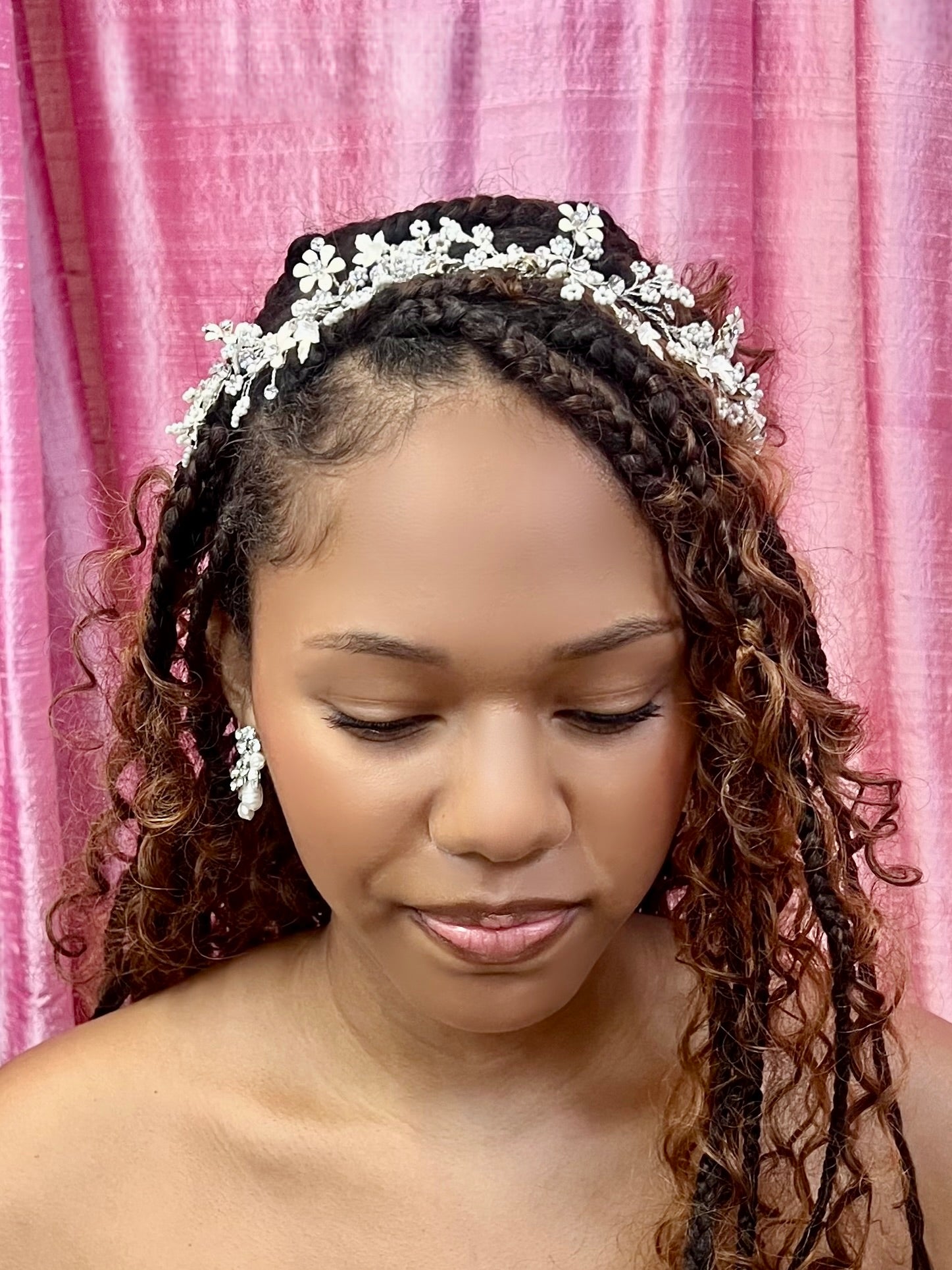 Sweet blush flowers frame your face for a delicate crowning touch. Our soft headband can be worn tied at the back or pinned in. It is made of blush enamel flowers, accented by metal leaves and sprays.