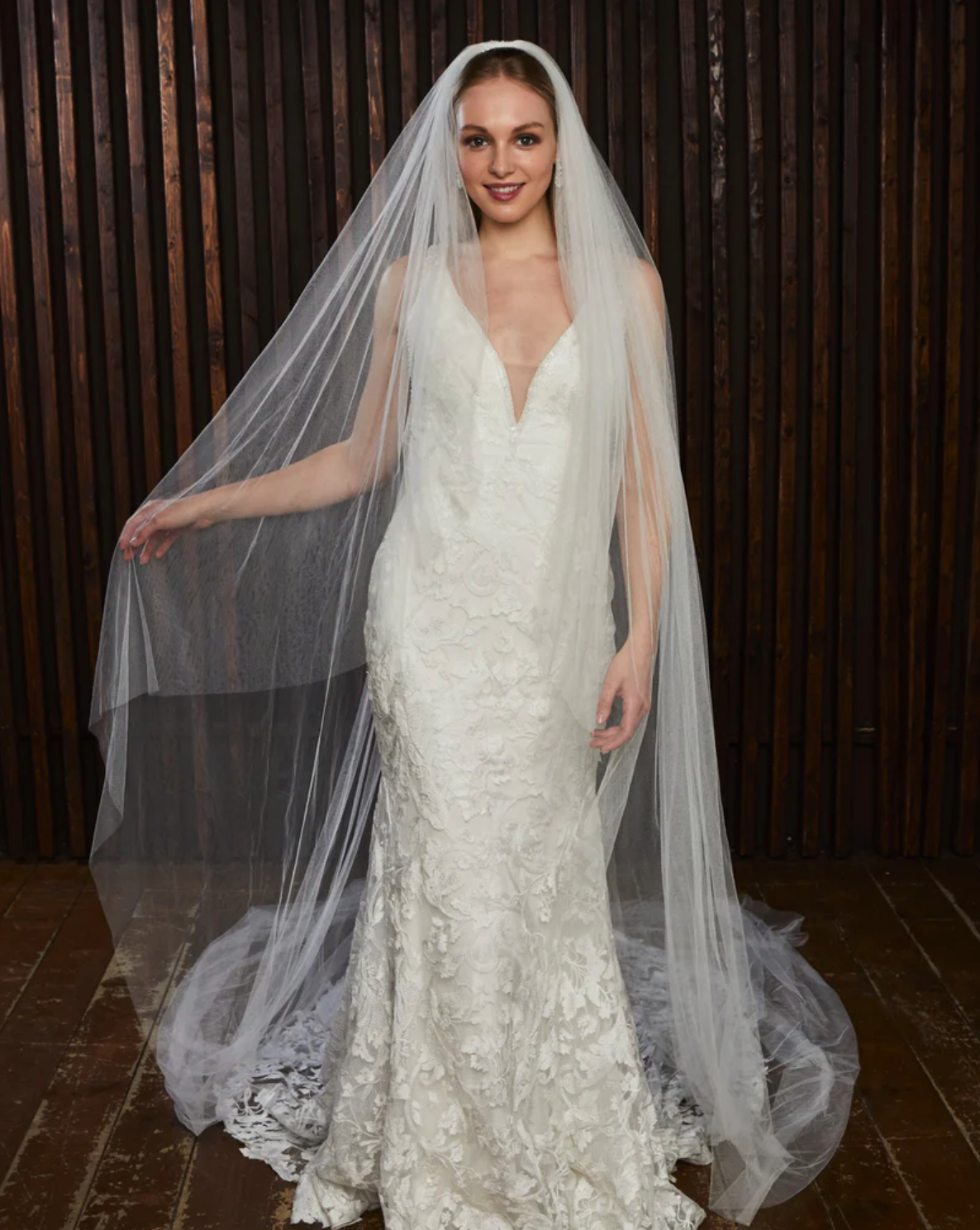 An ethereal and luxurious addition to your bridal ensemble. This exquisite veil is crafted from the finest soft tulle, featuring an angel cut that drapes gracefully to a cathedral length. Perfect for brides seeking a blend of elegance and romance.