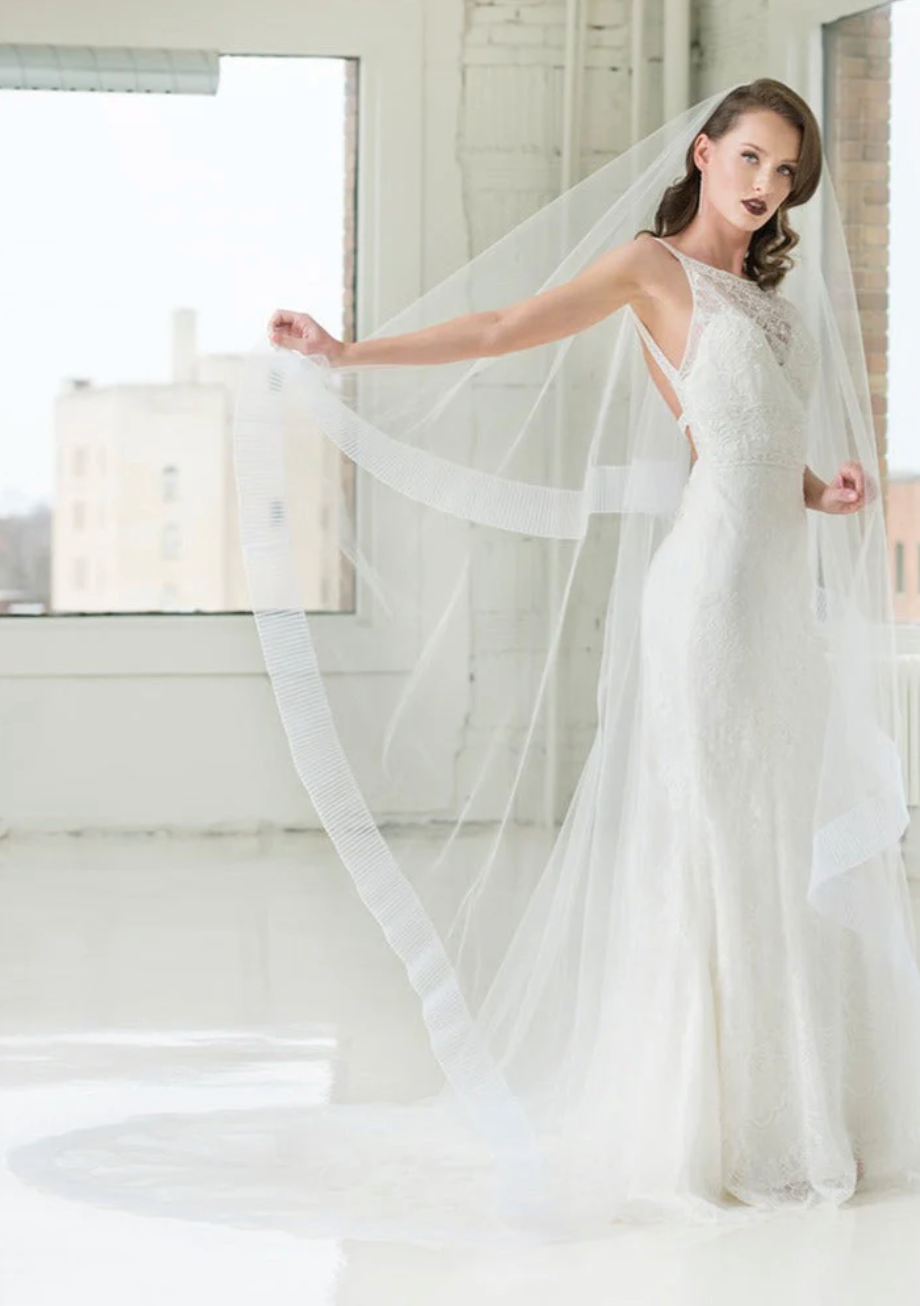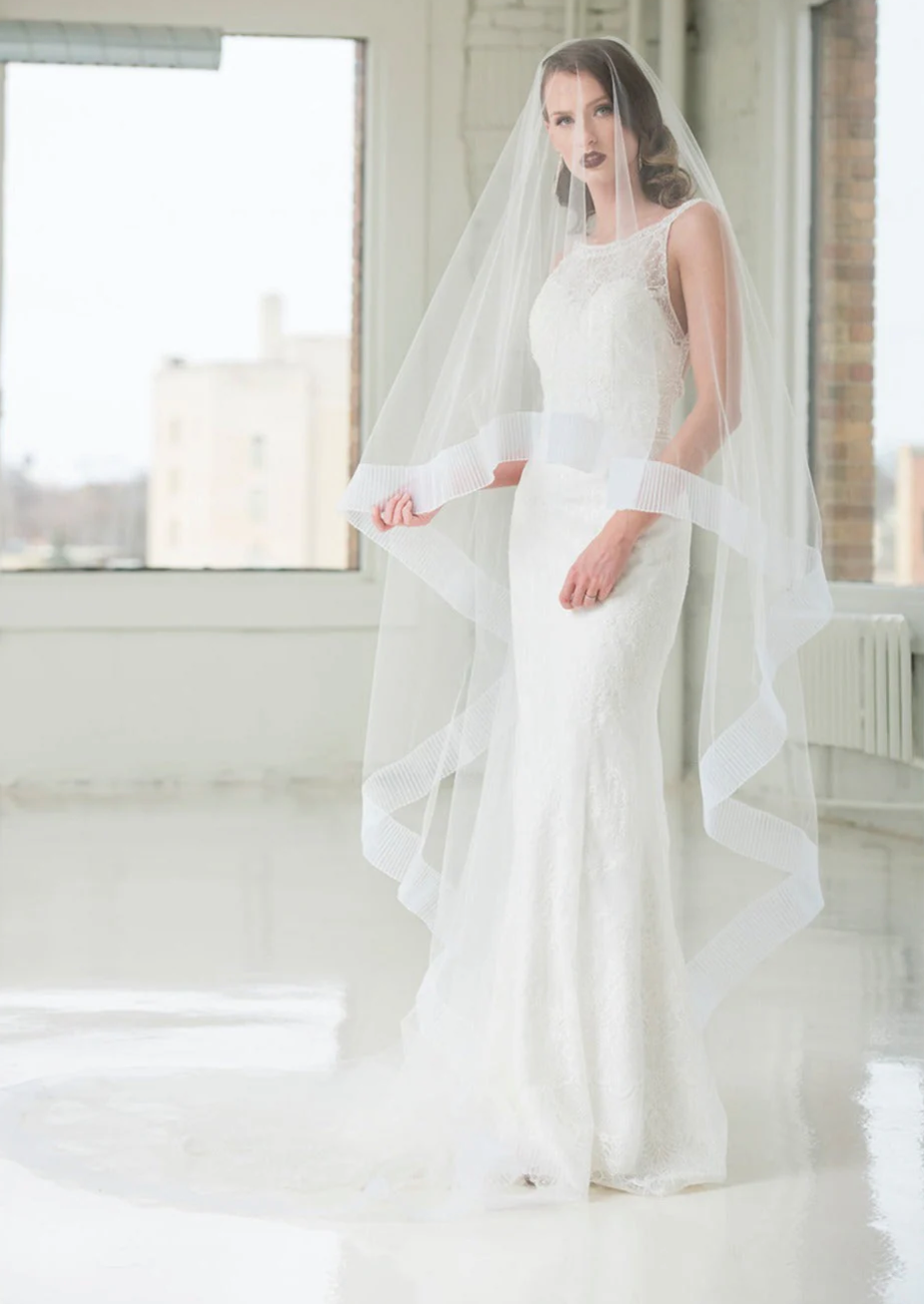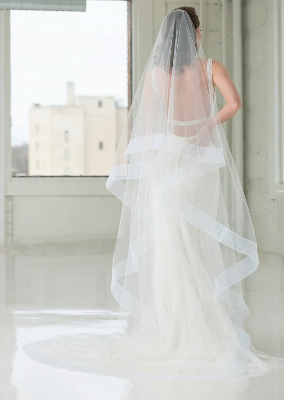 The Hana Ivory Pleated Horsehair Veil features a chic two-tier fold-over design with a fingertip length and delicate blusher. Its pleated horsehair trim adds a stylish twist, perfect for a bride looking to blend elegance with a fun, fashion-forward vibe.